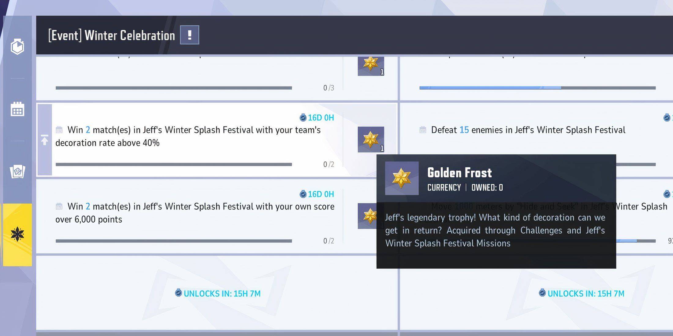 Gold Frost serves as the premium seasonal currency, obtainable by completing missions in Jeff's Winter Splash Festival arcade mode. Find these challenges in the Missions tab's [Event] Winter Celebration section, with each completed task rewarding one Gold Frost. This currency is essential for upgrading Jeff's seasonal card during the event.